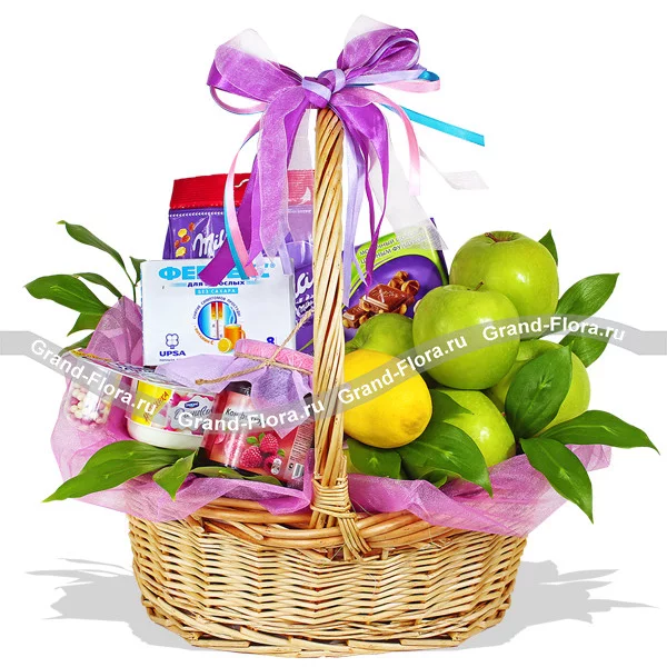 Уменьшеный: яблоки - 0,5 кг, лимон - 1 шт, шоколад "Milka" - 1 шт, даниссимо - 1 шт, конфитюр - 1 шт, Фервекс - 1уп., корзина малая, декор.