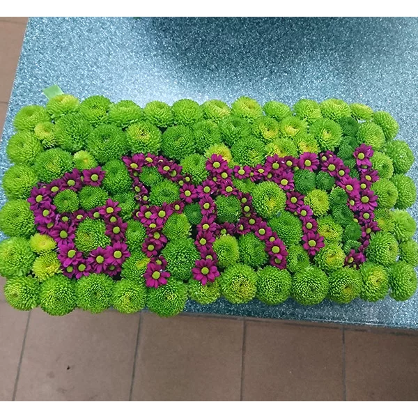 Уменьшенный: хризантема кустовая зеленая (сантини) - 11 шт., хризантема кустовая фиолетовая - 7 шт., оазис.