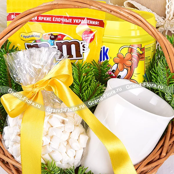 Стандартный: кружка - 1 шт., какао "Несквик" - 250 г., шоколад "M&M's" - 240г., маршмеллоу - 100 г., ель., корзина малая.