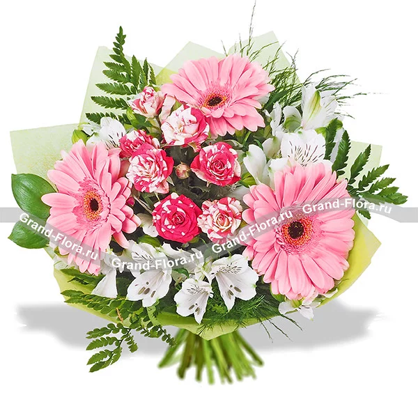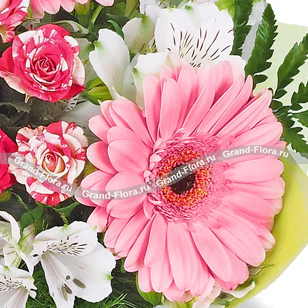 Если вы хотите признаться в своих чувствах и поделиться со своей девушкой теплотой своего сердца – лучший способ заказать букет с доставкой. Оригинальная флористическая композиция выполнена в сдержанных тонах. Красоту розовых гербер и пестрых роз по достоинству оценят молодые девушки. Чистоту и нежность придают восхитительные альстромерии, которые даже в срезанном виде продолжают цвести и пахнуть.